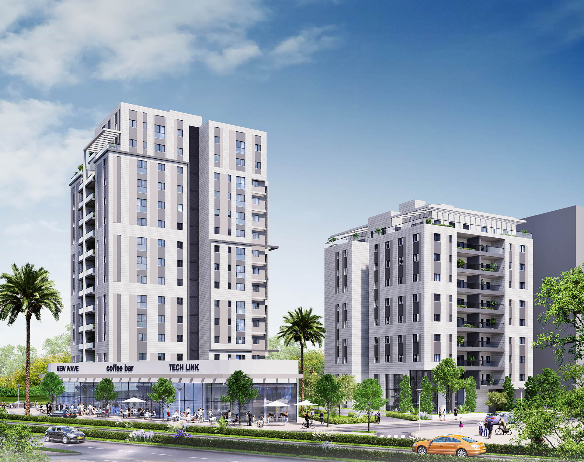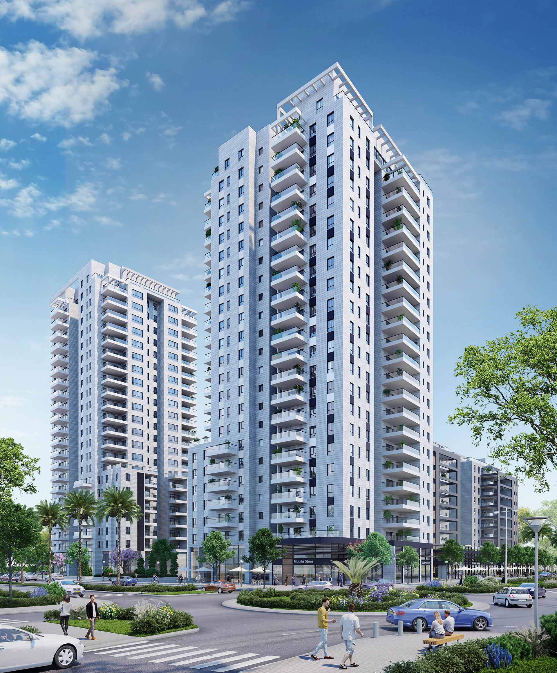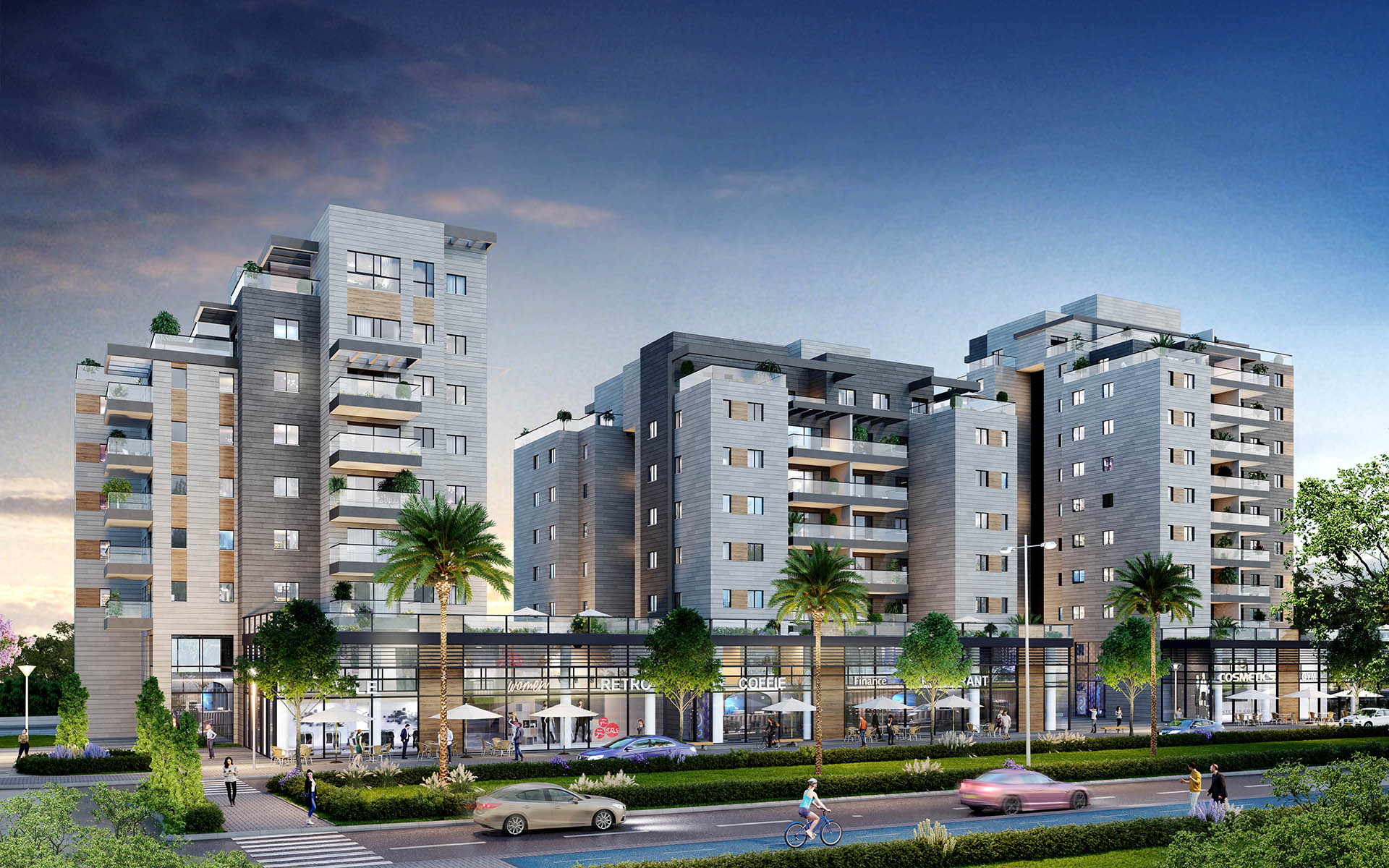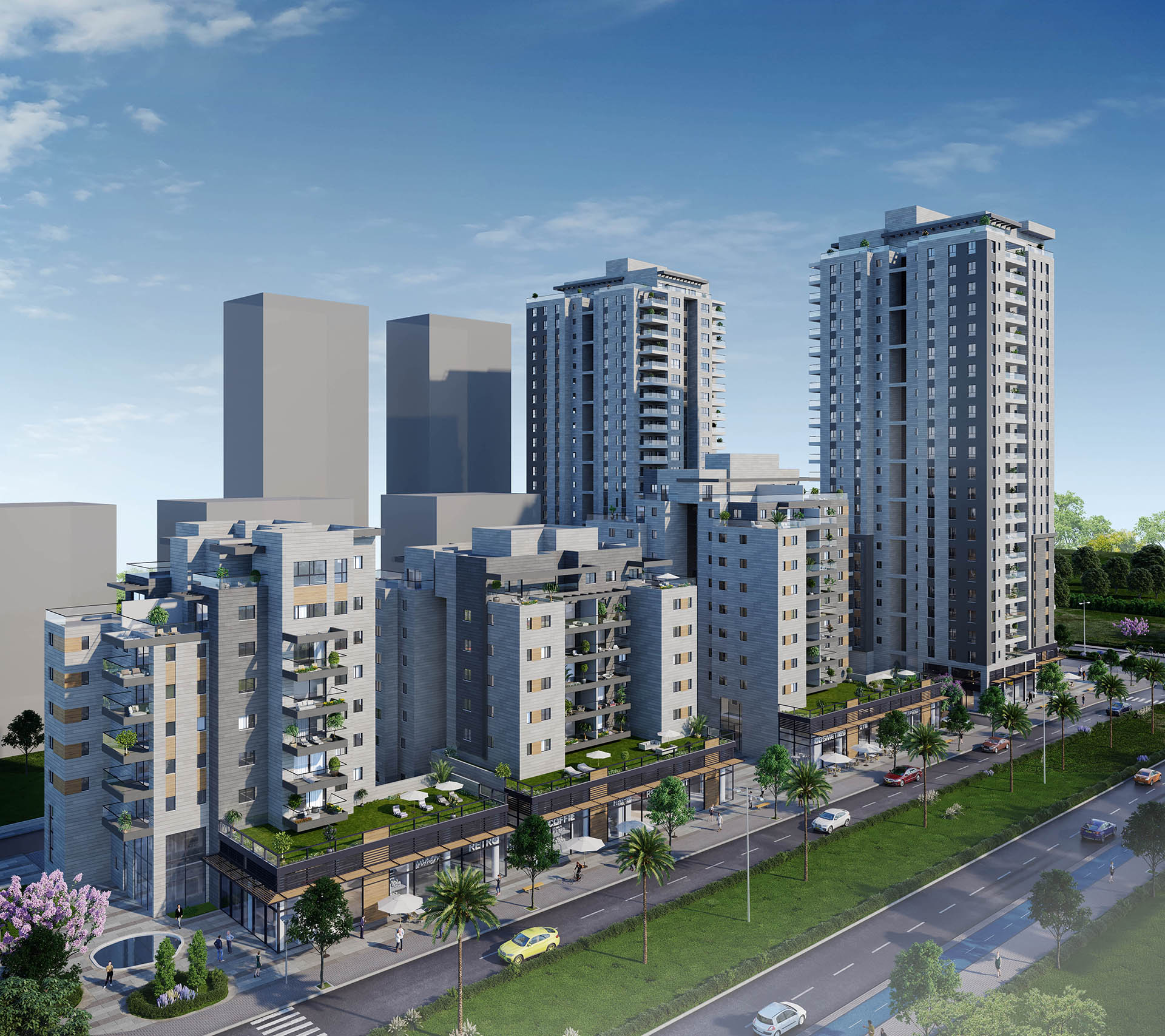 תמהיל החנויות מגוון ומיועד לתת מענה לצרכי תושבי השכונה וכולל בין היתר: בתי קפה, מסעדות, סופרמרקט, חנויות פארם, מרפאות ועוד
