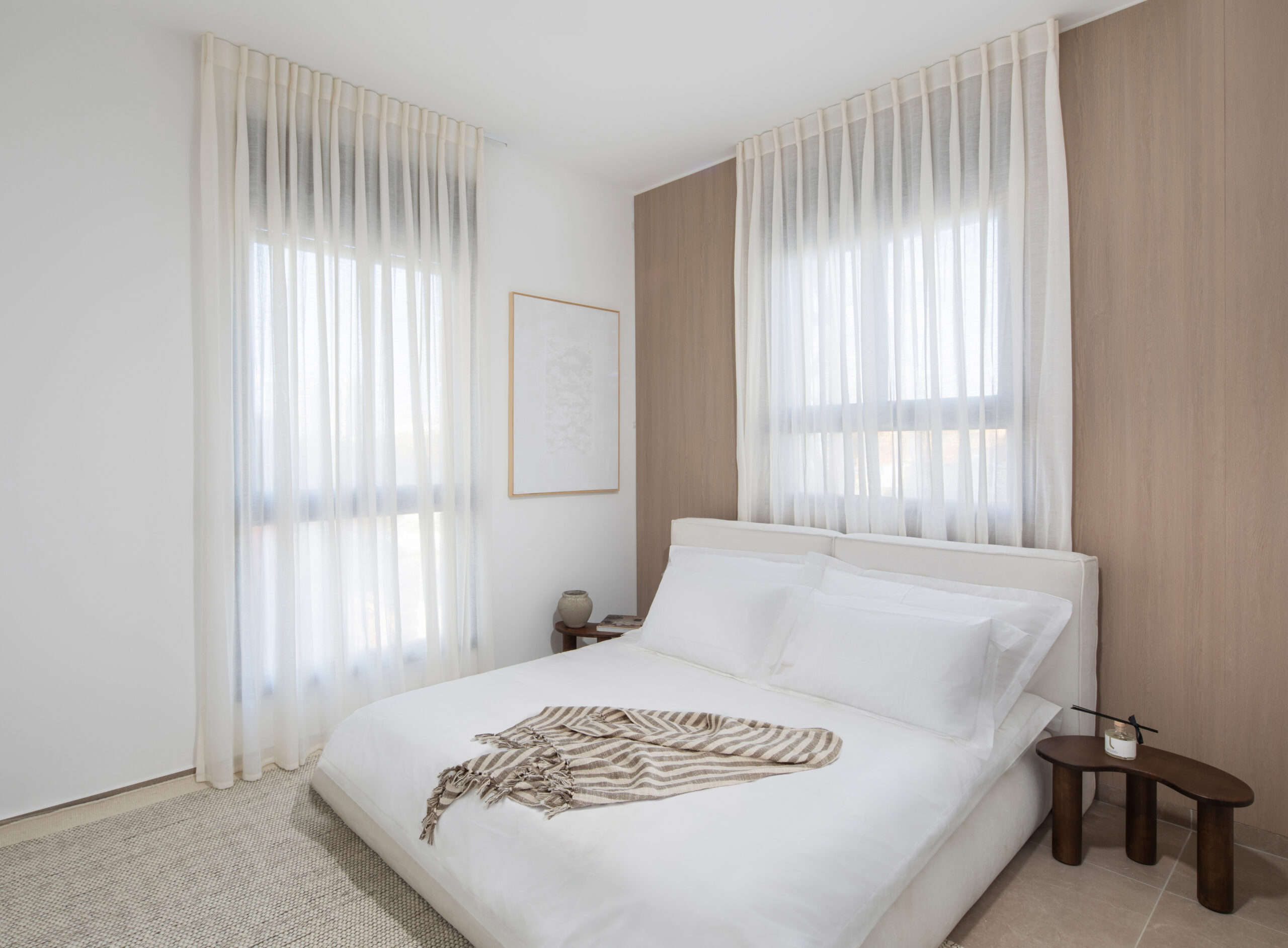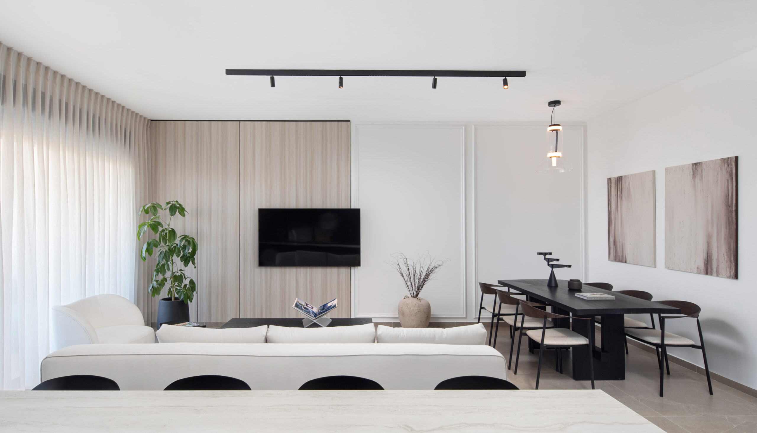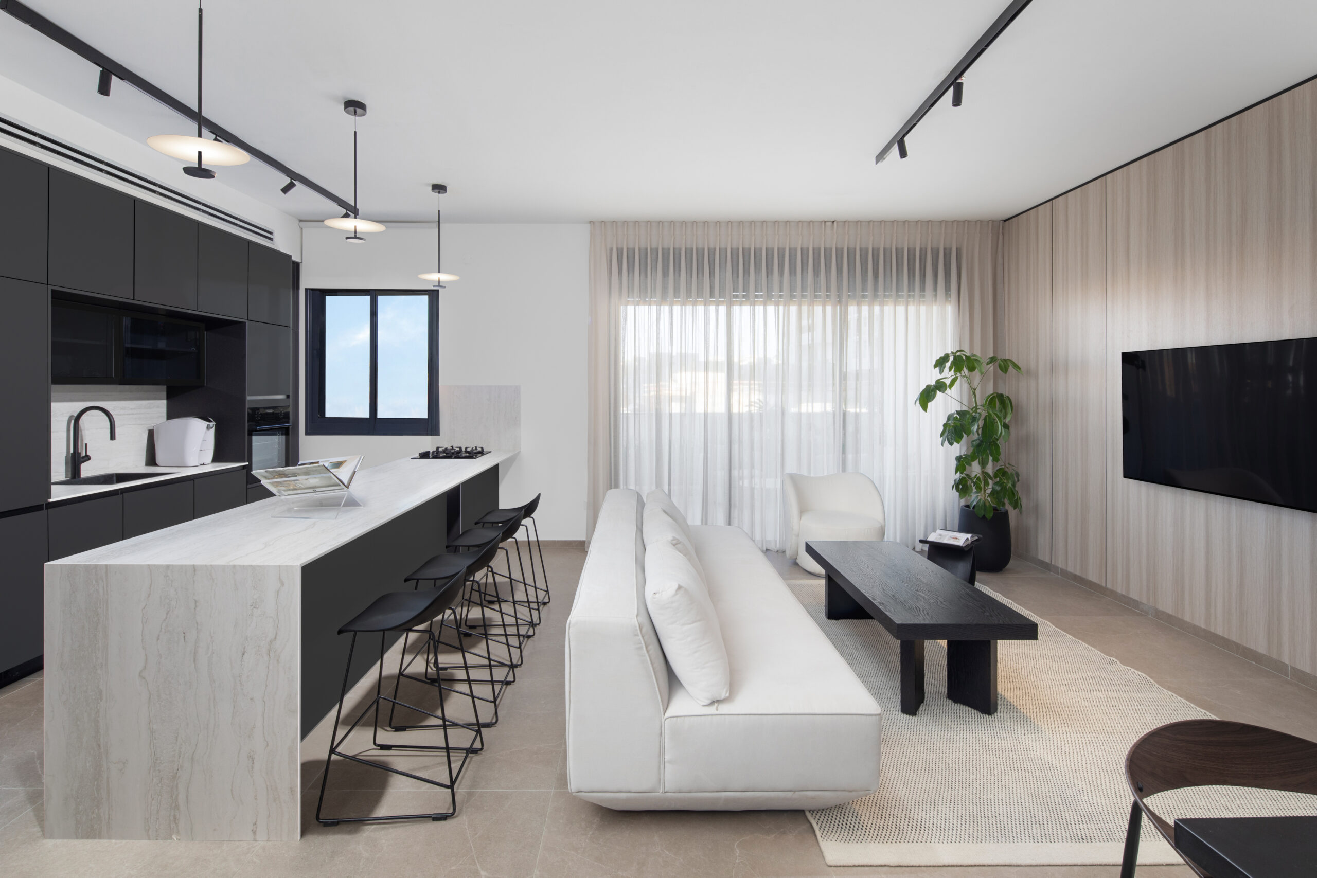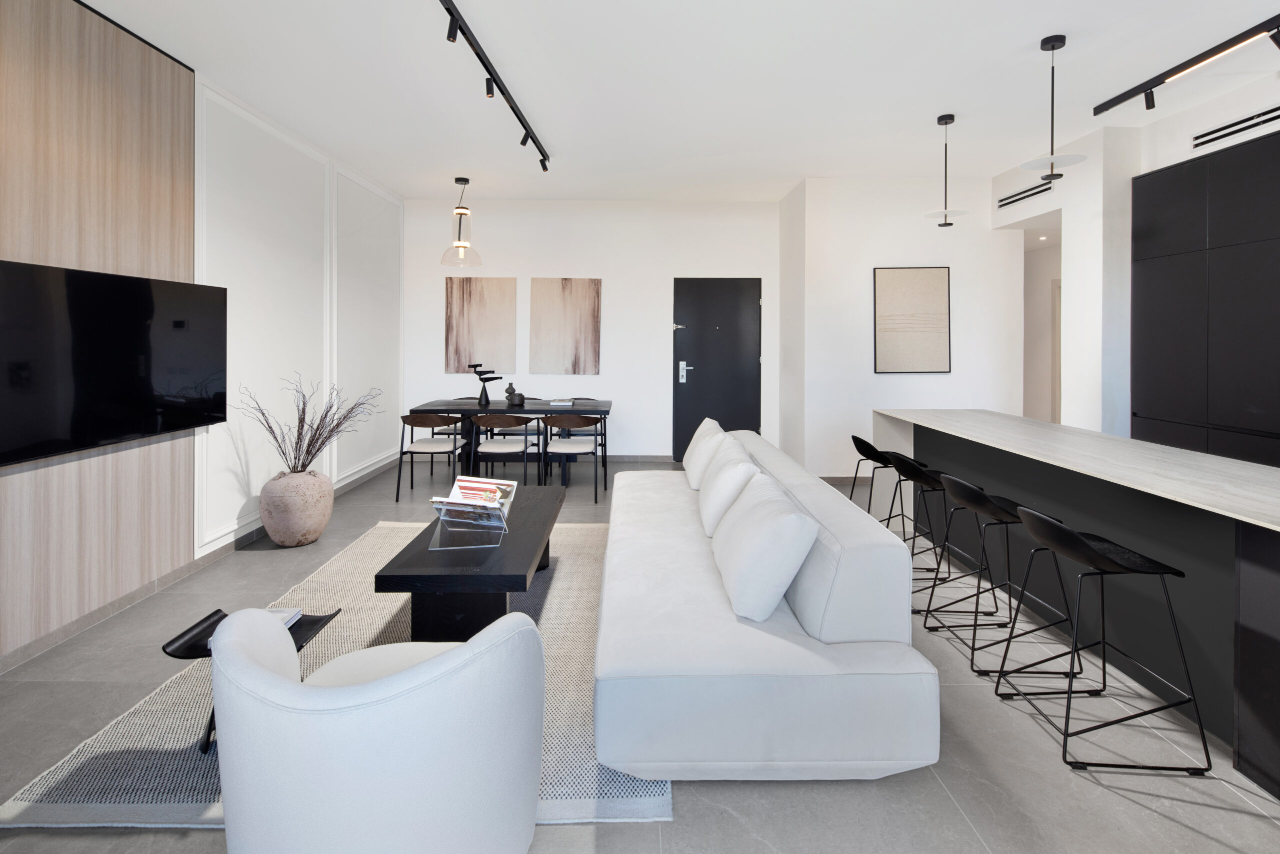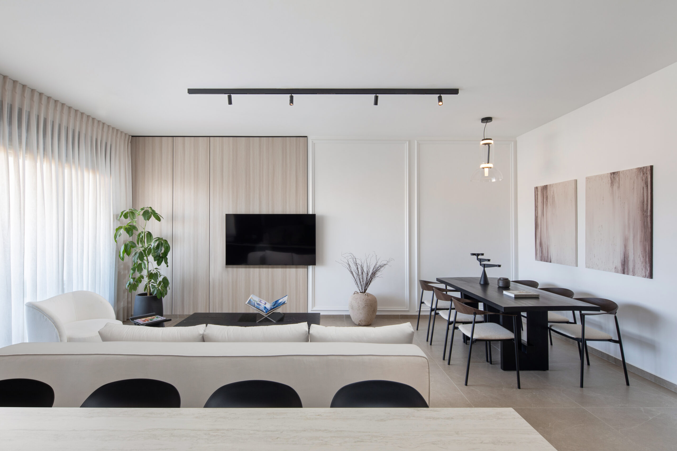 הדירה מתאפיינת באיזון מדויק בין חומר, אור ומרחב. קווים רכים, צבעים בהירים ופרופורציות מאוזנות מעניקים תחושת קלילות ונינוחות בכל חלל. מעבר חלק בין האזורים הציבוריים לפרטיים יוצר חוויה זורמת, שמזמינה להאט את הקצב ולהתמסר לאווירה הנינוחה. כל אלמנט – מהבחירות האסתטיות ועד לאופן שבו החלל נושם – תוכנן ליצירת סביבה שקטה, מדויקת ומוקפדת.